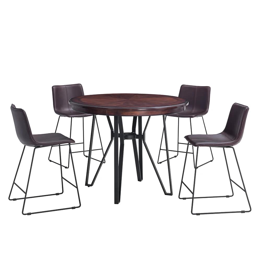 Upgrade your dining space with this 5 Piece Round Pub Table Set. The rustic and industrial-inspired design comes through in the matte black metal legs and simple lines. These stool seats are upholstered in PU leather, with foam padding and a slightly reclined chair back for comfort. The bar stool features a stitched grid design for effortless style and sled base legs. The table top features a graceful, rounded top, constructed of MDF with birch veneer. This collection can be easily coordinated with the existing decor in your dining room, kitchen, or breakfast nook to complete your space’s handsome, industrial look.