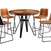 Upgrade your dining space with this 5 Piece Round Pub Table Set. The rustic and industrial-inspired design comes through in the matte black metal legs and simple lines. These stool seats are upholstered in Two-tone PU (Black & Brown) leather, with foam padding and a slightly reclined chair back for comfort. The bar stool features a stitched grid design for effortless style and sled base legs. The table top features a graceful, rounded top, constructed of MDF with birch veneer. This collection can be easily coordinated with the existing decor in your dining room, kitchen, or breakfast nook to complete your space’s handsome, industrial look.