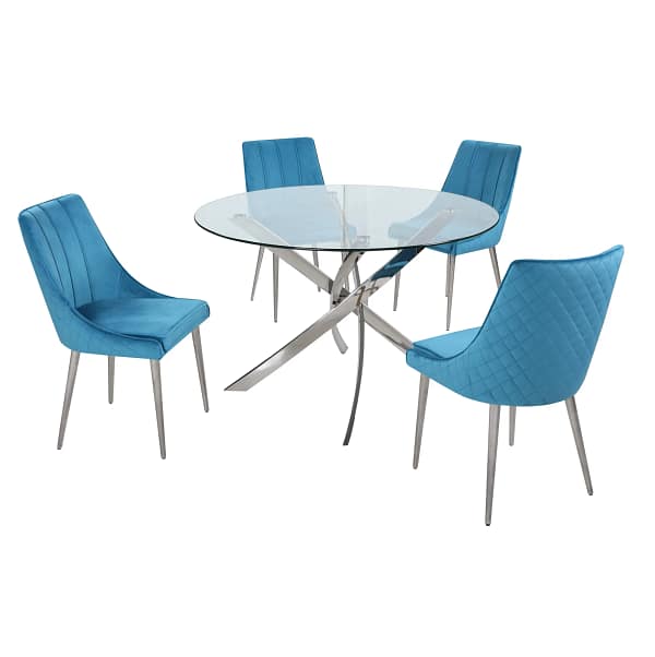 Upgrade your dining space with this ​5 Piece Dining Table Set. The strikingly elegant dining table is a stylish and modern combination of chrome and glass, making this item a real eye-catcher. The chrome metal legs provide strong and sturdy support for the table, whilst the unique intertwined nest design exudes modern style. This table really is capable of being a centerpiece in any home! With a generous surface, you can dine in style with up to 4 guests. Combined with the luxurious velvet upholstered dining chairs, this set will shout luxury and style! A must-have for a chic dining experience!