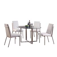 Upgrade your dining space with this 5 Piece Dining Table Set, featuring a tempered glass tabletop, durable rose silver metal frame and PU leather for a modern, stylish look. This set includes 1 table + 4 chairs, blending contemporary elegance with practicality. Perfect for kitchens, dining rooms, breakfast nooks, or bars. Sleek, modern design for any home!