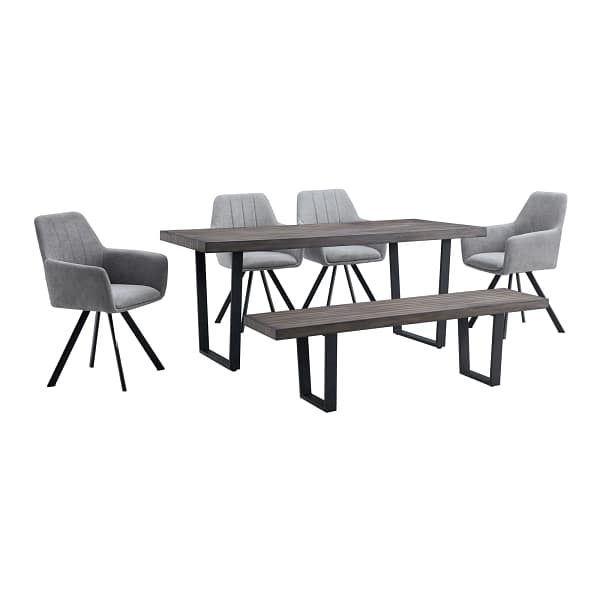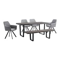 Upgrade your dining space with this ​6 Piece Dining Set, featuring a sleek ​metal frame, high-quality MDF with elm veneer and premium ​linen fabric​ upholstery. This dining table set is including a table, four swivel upholstered chairs and a bench. With its ​simple yet modern design, this set effortlessly complements any contemporary home decor. Perfect for family meals and entertaining guests, it combines style, comfort, and functionality. A must-have for a chic dining experience!