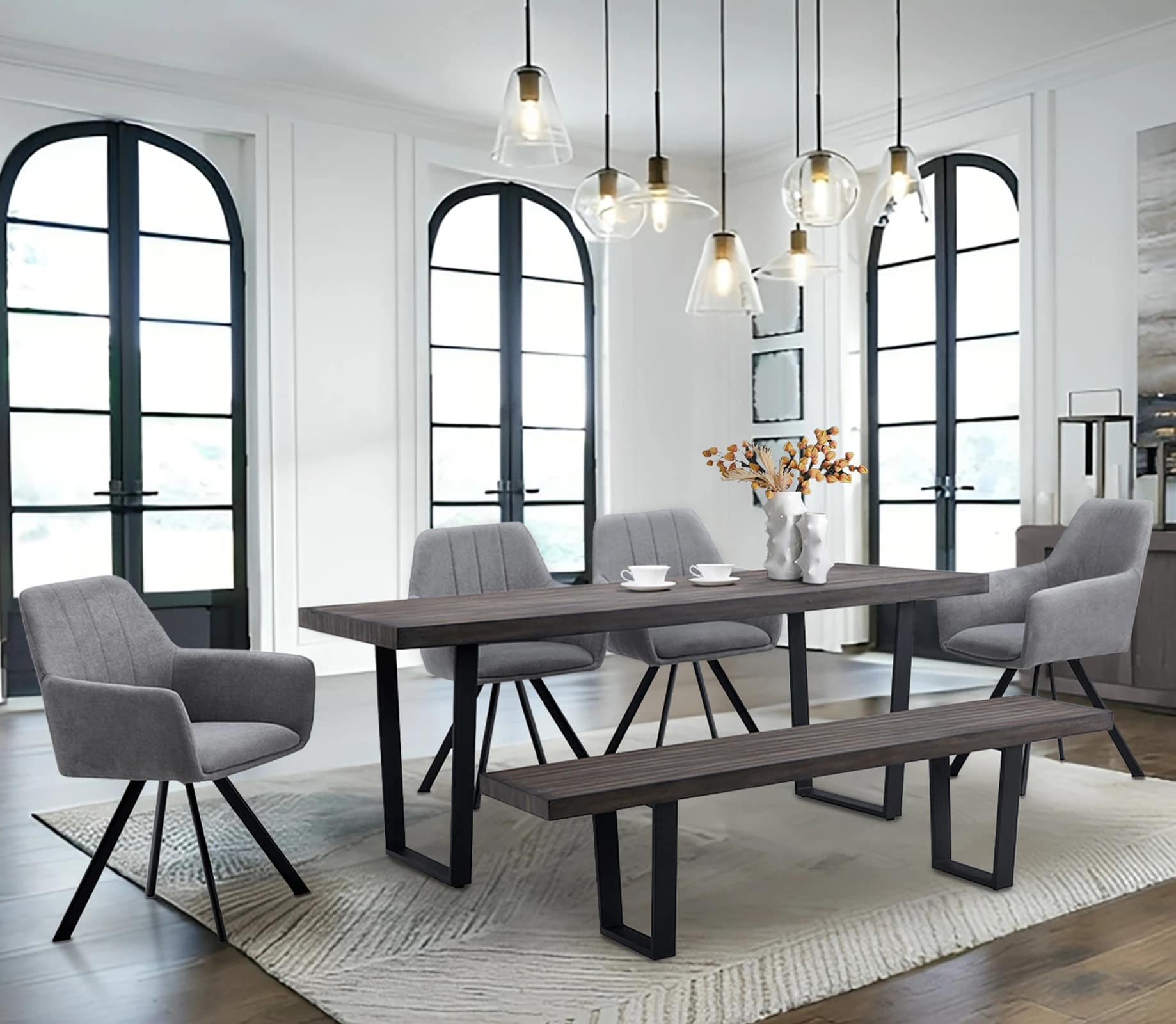 Upgrade your dining space with this ​6 Piece Dining Set, featuring a sleek ​metal frame, high-quality MDF with elm veneer and premium ​linen fabric​ upholstery. This dining table set is including a table, four swivel upholstered chairs and a bench. With its ​simple yet modern design, this set effortlessly complements any contemporary home decor. Perfect for family meals and entertaining guests, it combines style, comfort, and functionality. A must-have for a chic dining experience!