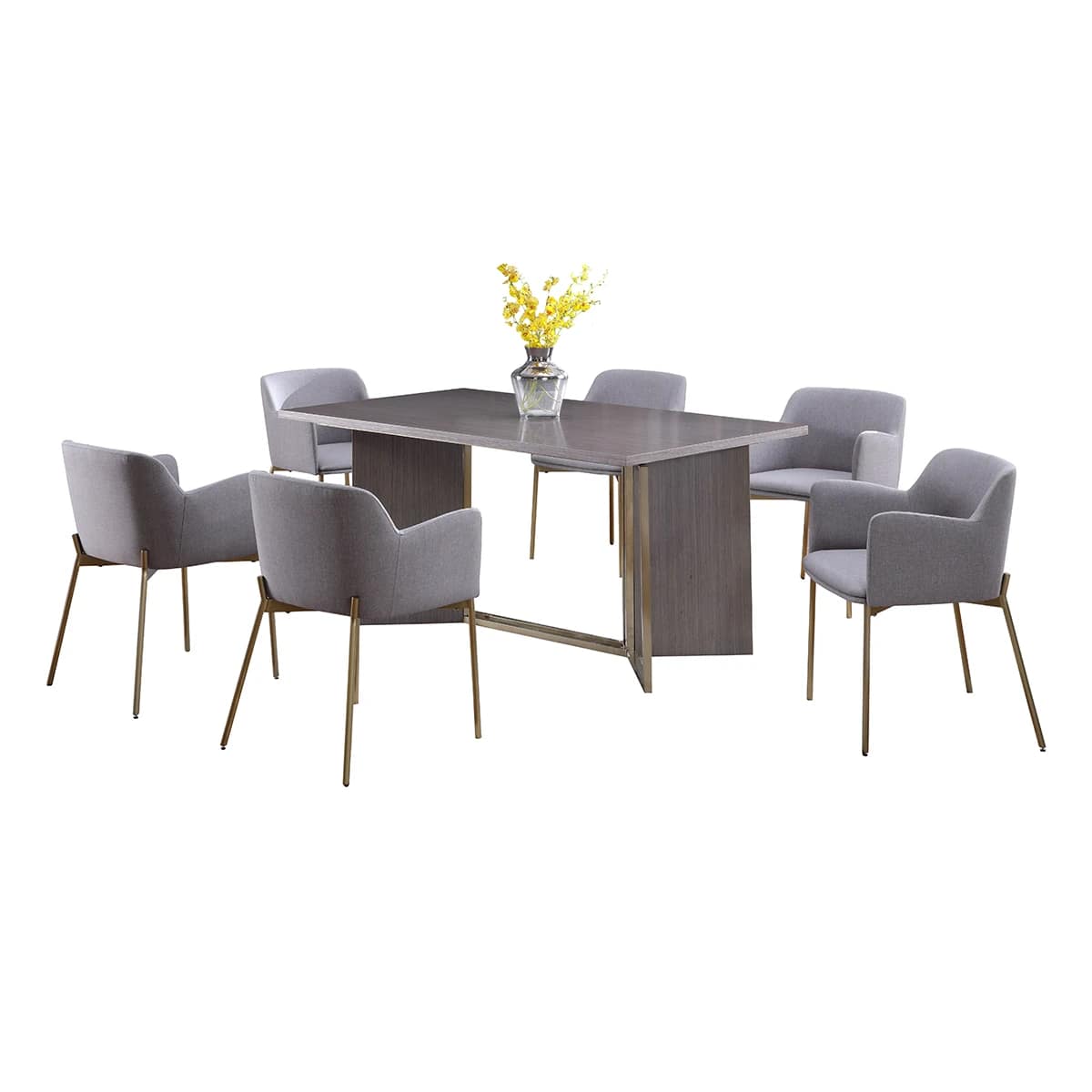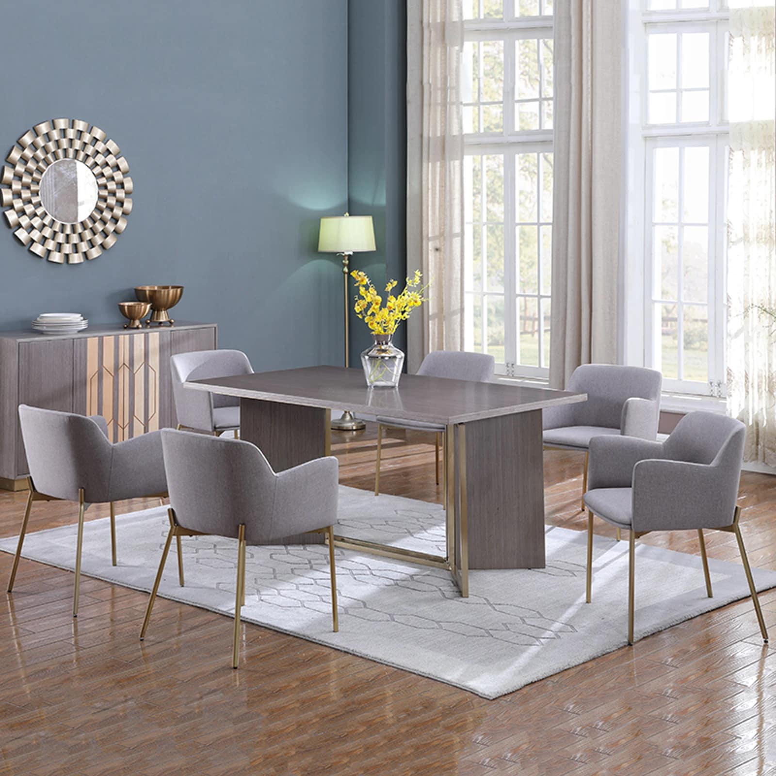 Upgrade your dining space with this ​7 Piece Dining Set, featuring a sleek brush rose gold stainless steel frame, high-quality MDF with technical veneer and premium linen fabric​ upholstery. This dining table set is including a table, six upholstered chairs. With its ​simple yet modern design, this set effortlessly complements any contemporary home decor. Perfect for family meals and entertaining guests, it combines style, comfort, and functionality. A must-have for a chic dining experience!