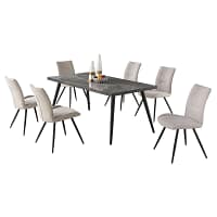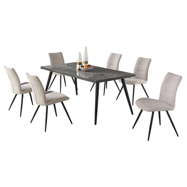 Upgrade your dining space with this ​7 Piece Dining Table Set, featuring a ​grey tile tabletop, durable metal frame and ​velvet fabric for a modern, stylish look. This set includes ​1 table + 6 chairs, blending ​contemporary elegance​ with practicality. Perfect for kitchens, dining rooms, breakfast nooks, or bars. ​Sleek, modern design​ for any home!