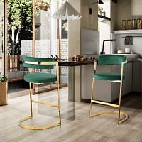 Upgrade your space with ​modern Bar Height Bar Stools with Back, with a sturdy ​300 lbs weight capacity, these stools remain stable without wobbling. The stylish gold metal footrest not only adds modern flair but also provides extra comfort and support for extended sitting. Both the upholstered seat and barrel backrest are made from soft velvet fabric, offering a cozy and skin-friendly touch for ultimate relaxation. Perfect for ​restaurants, kitchens, living rooms, beach bars, offices, cafes, and more. Elevate your seating with comfort and elegance.
