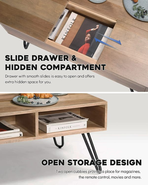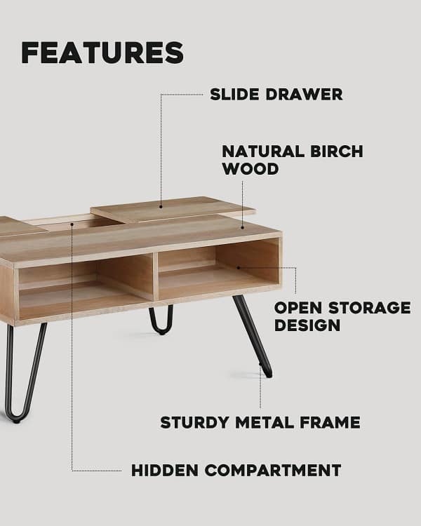 Upgrade your living space with the ​Slide Top Storage Coffee Table, crafted from ​birch veneer, PB, and a sleek black metal frame. This stylish ​modern coffee table​ offers ​ample storage​ to keep your space tidy while doubling as a ​perfect dining or work desk. Its ​sleek design​ blends seamlessly into any contemporary home, making it a ​must-have for your living room. Functional, spacious, and chic—ideal for meals, homework, or storage. Elevate your decor with this ​versatile centerpiece​ today!
