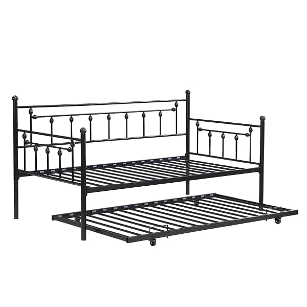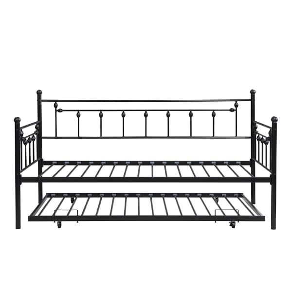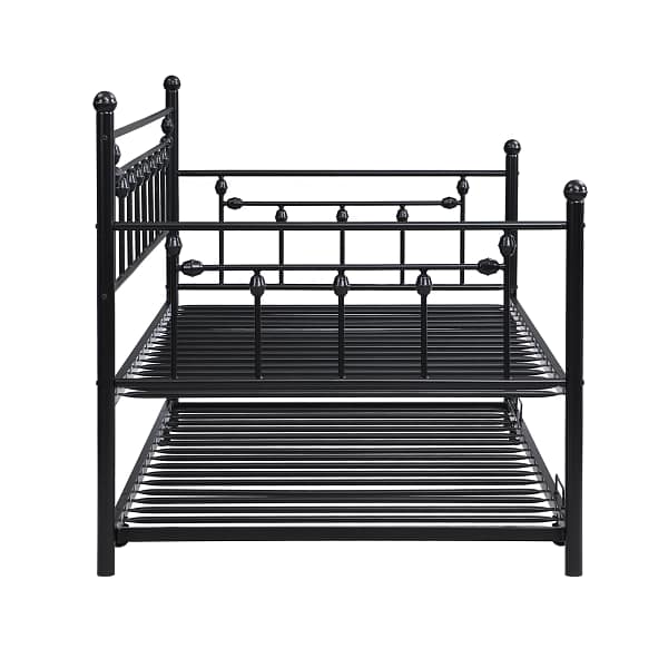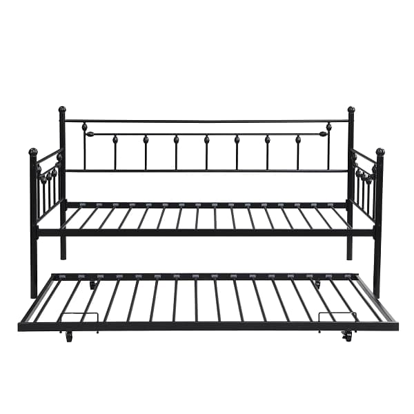Upgrade your space with this Daybed With Trundle, crafted from a sturdy metal frame. The linear Victorian design with rounded finials gives any room a spark of style that’s both modern and timeless. Your kids can read, play and sit back by day, then sleep soundly on the daybed when it’s time for lights out. For overnight guests, just pull out the trundle, which is mounted on four easy-glide casters. All you need are some pillows and throw blankets for color, and you’re all set! Multi-functional, a god-level solution for small spaces!