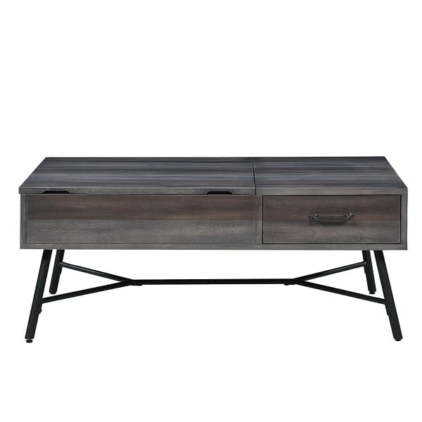 Upgrade your living space with this Drawer Lift Top Coffee Table, blending modern functionality and timeless style. Crafted from birch veneer and PB with a sleek black metal frame, it combines rustic wood grain with matte metal legs for a versatile look. The multi-layer partition storage includes an open tabletop, hidden storage, and a spacious drawer. The adjustable lift-top allows flexible height settings for dining, working, or lounging. Plus, the built-in USB charger keeps devices powered. A perfect mix of stylish design and smart storage for any contemporary home!