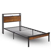 Upgrade your bedroom with this twin-size metal platform bed, featuring a sleek black metal frame and elegant wooden headboard & footboard. Designed for durability, it includes strong metal slats and sturdy metal support. The modern stylish design combines functionality with comfort, enhanced by convenient USB ports and ambient LED lights. Perfect for a contemporary bedroom, this bed frame offers both style and practicality.