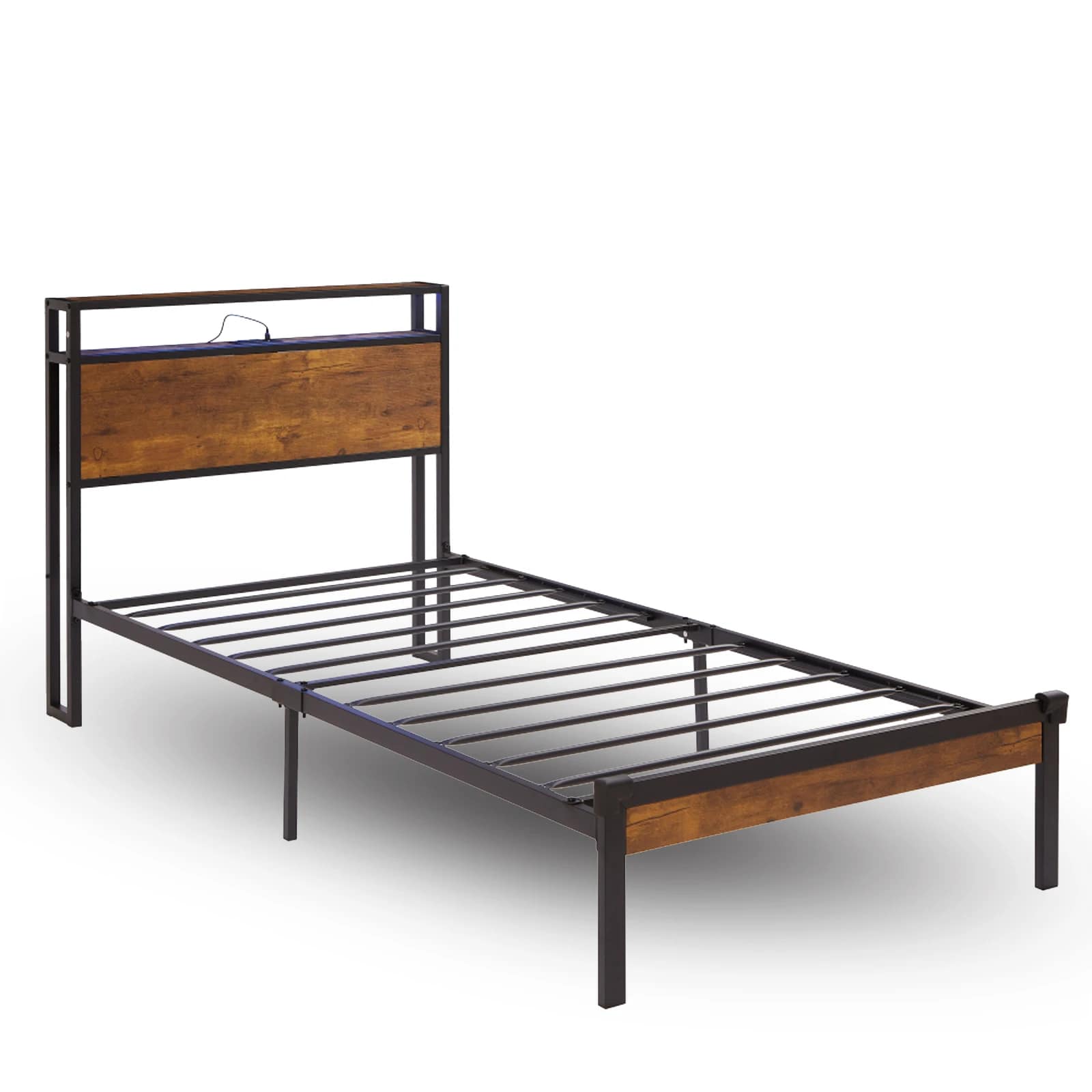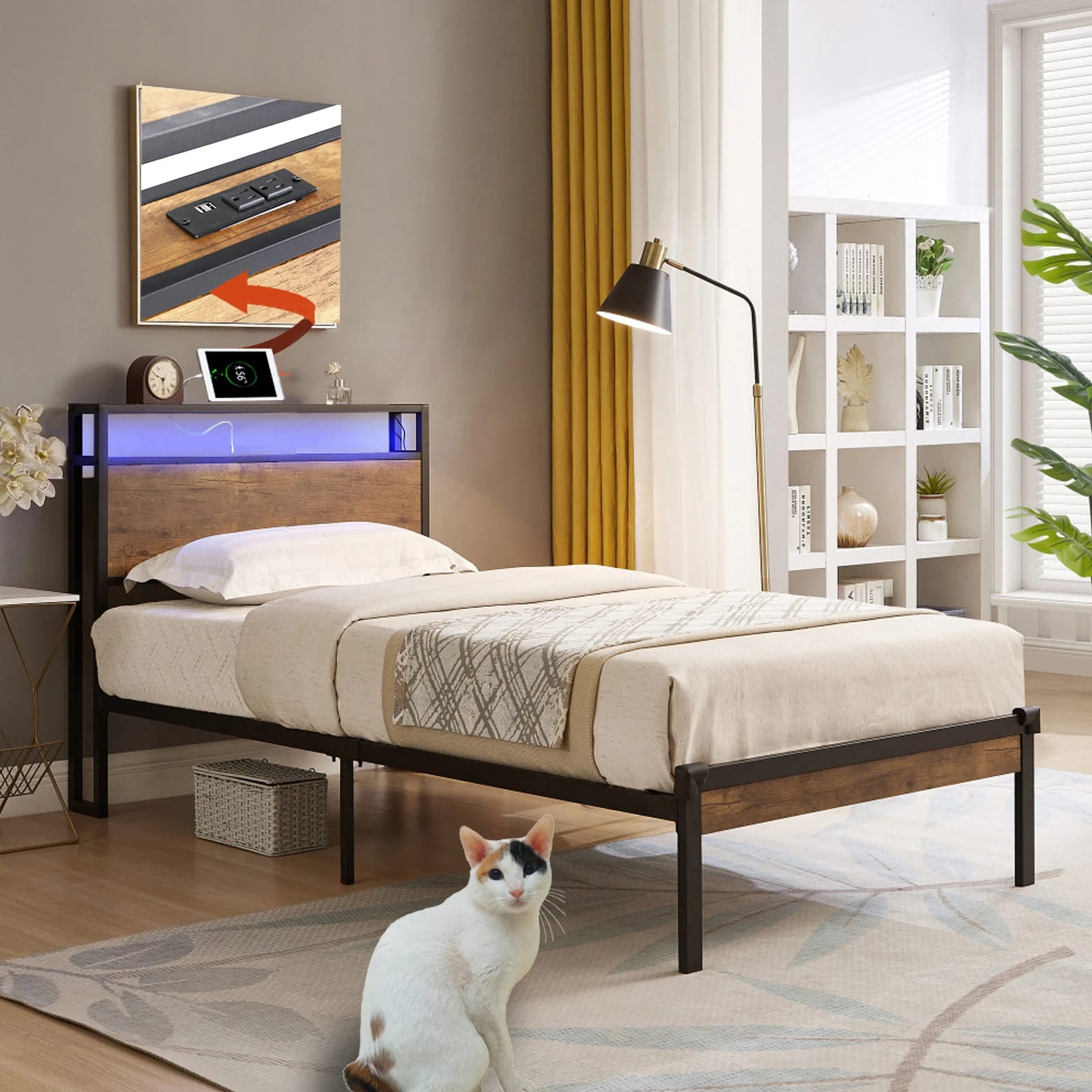 Upgrade your bedroom with this twin-size metal platform bed, featuring a sleek black metal frame and elegant wooden headboard & footboard. Designed for durability, it includes strong metal slats and sturdy metal support. The modern stylish design combines functionality with comfort, enhanced by convenient USB ports and ambient LED lights. Perfect for a contemporary bedroom, this bed frame offers both style and practicality.