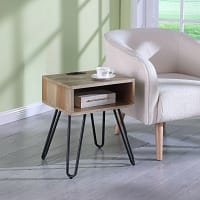 Upgrade your space with this stylish end table with USB charger, crafted from birch veneer and PB with a sleek black metal frame. Combining rustic wood with matte metal legs, it offers a timeless look that complements any decor. The modern, chic design blends functionality and aesthetics, featuring built-in USB ports for convenient charging. Perfect for living rooms, bedrooms, or offices, this side table merges practicality with elegance. A must-have for contemporary homes!